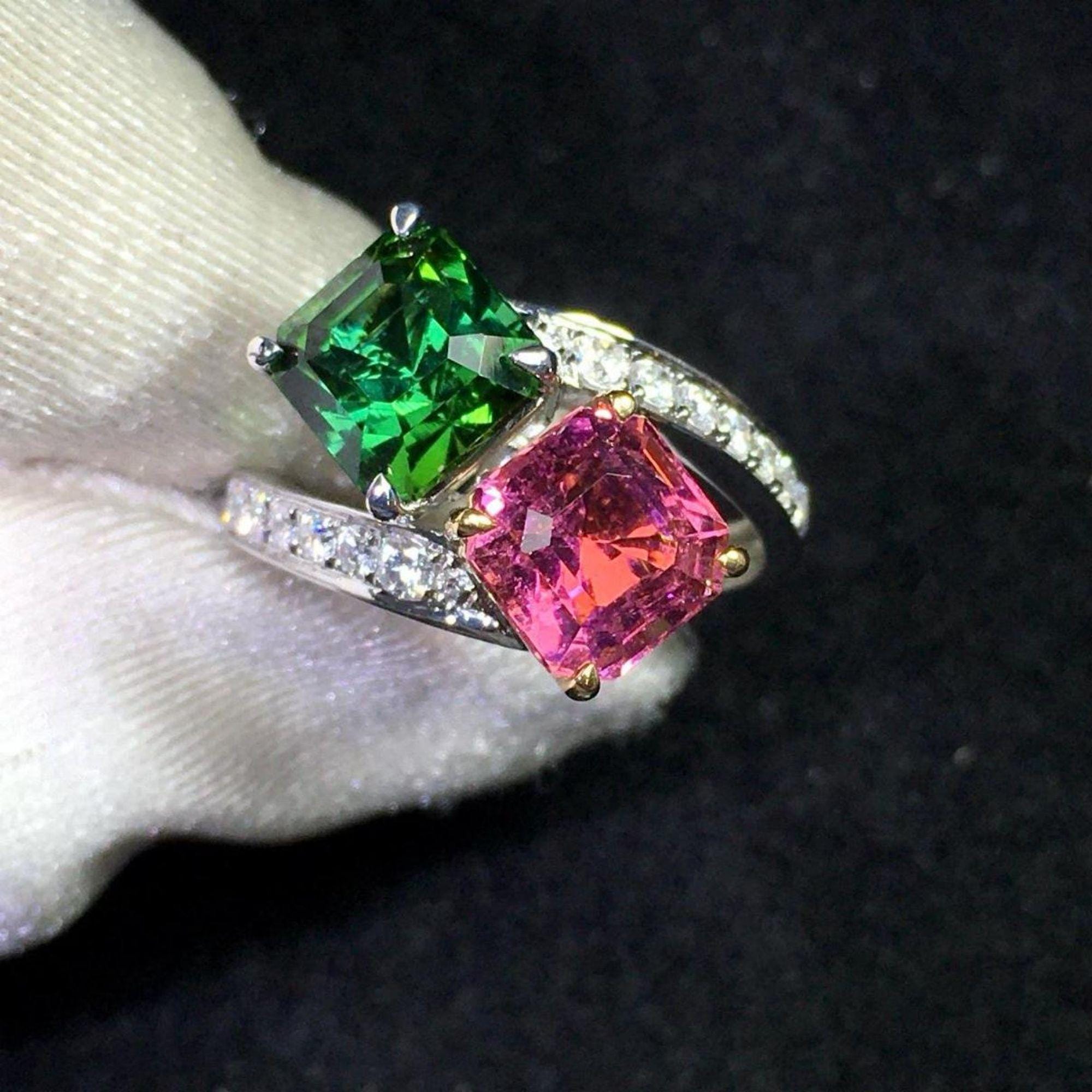 Natural green pink two tone tourmaline engagement ring/unique 18k rose gold diamond green tourmaline ring for women/bridal jewelry/boho band